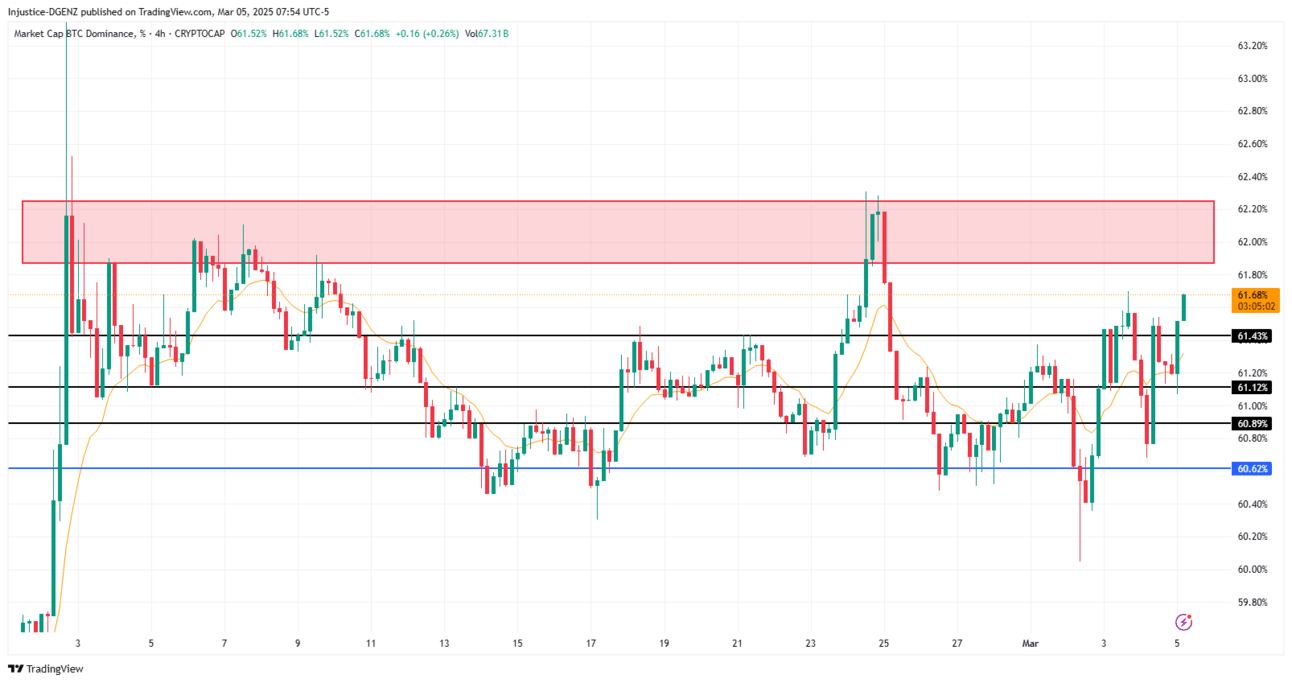 Looking at the 4HR chart on $BTC.D we can see that it is currently heading back towards our major level of resistance at about 62%. And if you were to look at the daily chart, we can see that we put in a huge deviation move underneath the range low support at 60.62%, which is why Bitcoin got its run from $85k up to $95k on Sunday following Trumps post about the Bitcoin Reserve. Looking further ahead, we should see $BTC.D reject again from the red box and eventually come back to test the SR at 60.62% which should give alts a chance to recover.