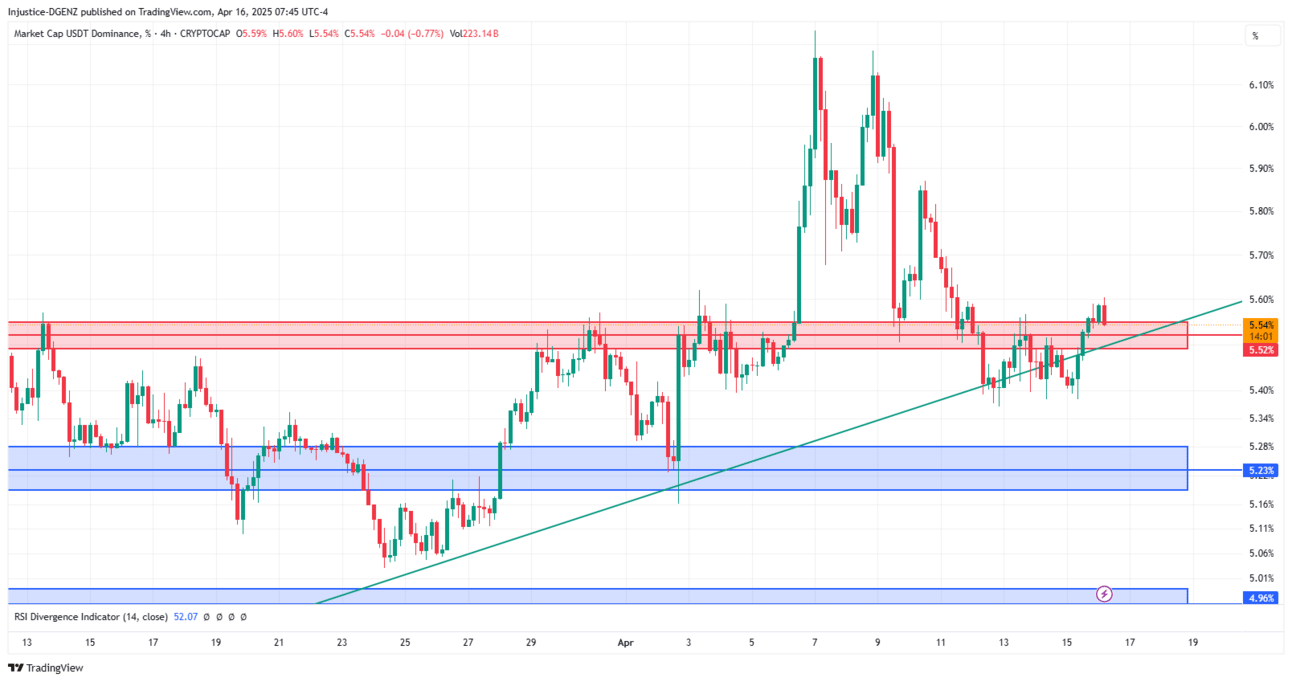 The USDT.D chart shows the market dominance of Tether (USDT), indicating the proportion of crypto market value held in Tether and reflecting investor sentiment towards risk, as higher dominance often signals a move towards stability.