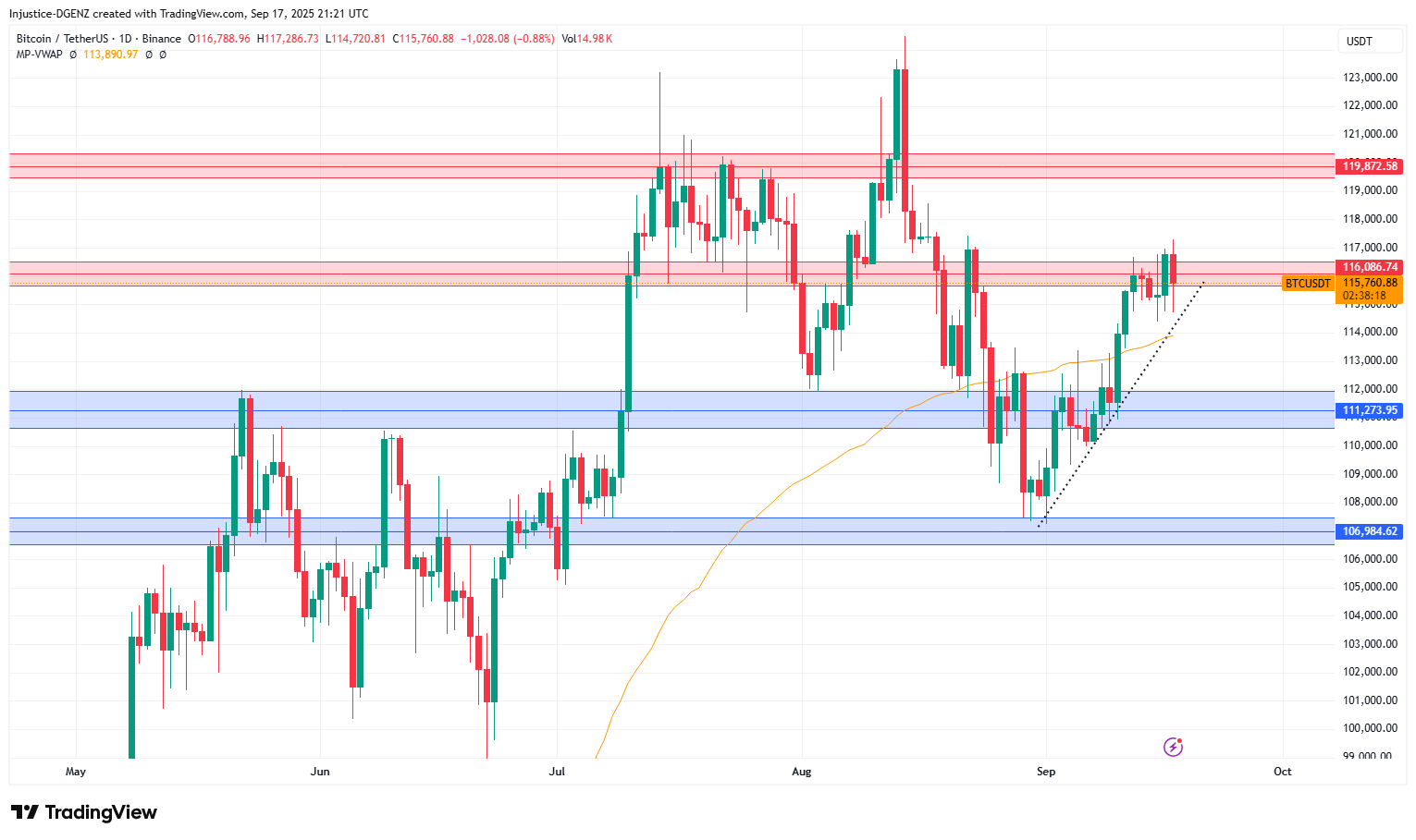 Alright folks, it’s decision time for the big orange coin. While the macro bias is still bullish with new ATH/HH on the horizon, the chart’s starting to cook up a retest play that’s worth watching. I’m eyeing a move back to $113.9K where our 1D QVWAP lies. This would be the first clean retest since the breakout and a textbook spot to take a long position. From here, there’s only two ways I see this playing out: First and the less likely of the two is that BTC skips the dip and rips straight to $119.5K. That would tag a key resistance level and coincide with a support retest on the $STABLE.C.D chart. Would make a lot of technical sense, even if it's a bit too clean. But secondly, and what I think we most likely see happen is that price dips first to the $114K–$113.8K zone, gives us that sweet VWAP/trendline kiss, and then bounces hard. Clean structure, strong confluence, and ideal for leveraged degens. As for the people crying $100K breakdowns again… I’m not buying it. Yes, CT is panicking (as usual), but unless something major shifts in the price structure, those ultra-bear takes look hella early. Until then, bulls have the edge.