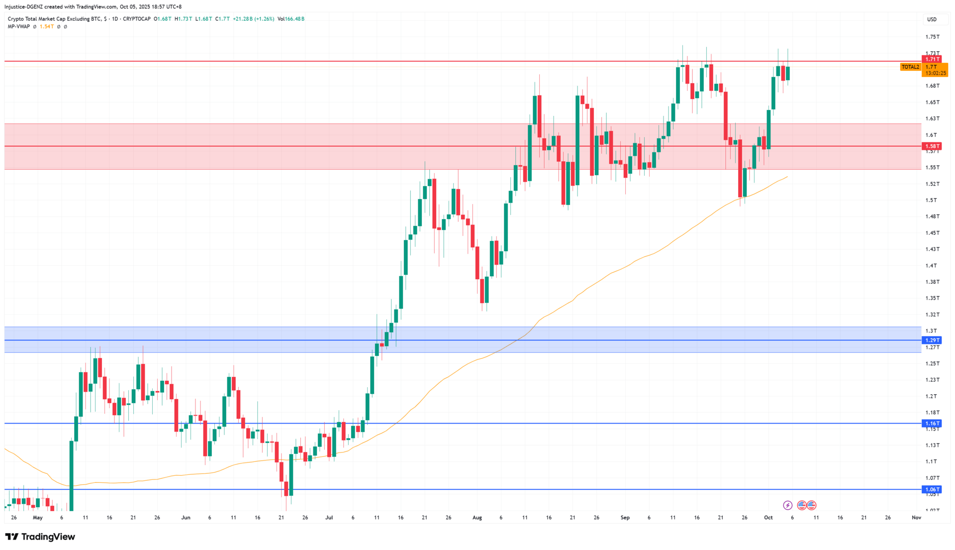 As $BTC set all time highs today, $BTC.D also ran into resistance which is why we can now see it begin to cool off. This is good for alts as long as $BTC can at least remain stable, but what we really want to see is Bitcoin continue to climb while $BTC.D drops, this is when altcoins start to move up fast and we can see another solid rally across the board.