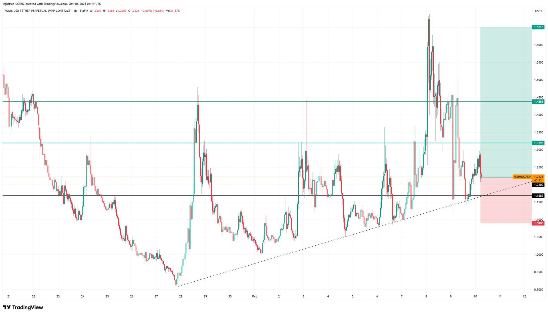 We have a solid up trend on the 1HR here so I’ve taken a low lev long from $1.22. I also have a DCA lined up at $1.1689 that is double the size of my entry in case we go back to test our hourly support and trendline. Stops are a 4HR candle close below $1.09. You could also take this same setup spot if you prefer. Take profit levels are marked in green.