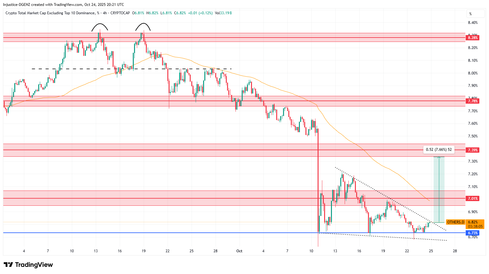 The $OTHERS.D chart (aka total crypto dominance excluding top 10) is tightening inside a classic falling wedge, which is just technical speak for a downtrend that's losing steam and looking to pop. You’ll see it’s been printing clean lower highs and lower lows. But now? Compression is just about maxed out. It’s coiled like a spring and itching to move. The safest play for bulls here is a breakout followed by a clean retest. That’s your signal. The technical target? Around 7.4%, which is a full rip through the 7% resistance. But don’t forget, targets are just technical, not guarantees. Although it’s looking like the upside is starting to outweigh the chop. Sit tight, wedge breakouts are where the real moves begin.