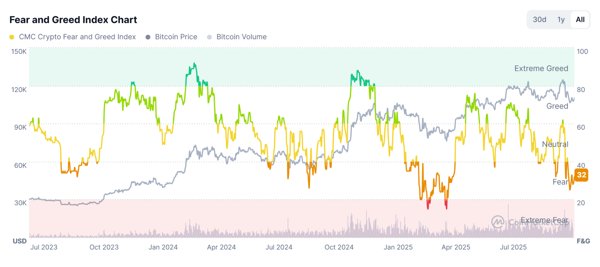 The charts might be snoozing after the October 13 crash, but sentiment? It’s falling off a cliff. The Fear & Greed Index took a nosedive from Neutral to Fear, and it’s teetering on the edge of Extreme Fear. Usually these dips are quick, a few days max, but this one’s overstaying its welcome at 10+ days and counting. Bad news? Vibes are trash. Good news? This kind of fear usually marks a local bottom. So yeah.. fear’s up, price is down, but this is often where the best setups are born. Chill out, zoom out, and prep your bags.