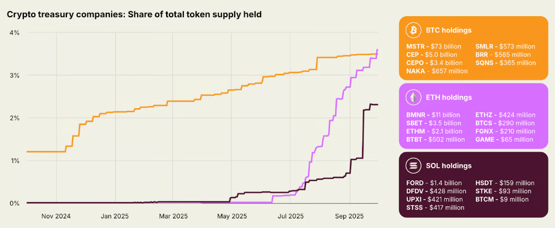 Michael Saylor’s MicroStrategy ($MSTR) has been going full degen, throwing down a wild $7.3B+ on Bitcoin. Yeah.. that’s not a typo. Billions. With a B. And yet, it’s no longer the biggest story in town. Digital Asset Treasury (DAT) companies now collectively hold $82.56B in BTC and $18.09B in ETH. But here’s the twist: ETH is having a bigger impact on supply than BTC despite holding only a fifth as much. Why? Simple math. ETH is cheaper, so treasury buys lock up more of the total supply. And when supply tightens, price tends to rip. But let’s not forget our favourite coin, Solana went on an absolute tear last month and leads me to believe we may be retelling this story by years end in its favour instead.