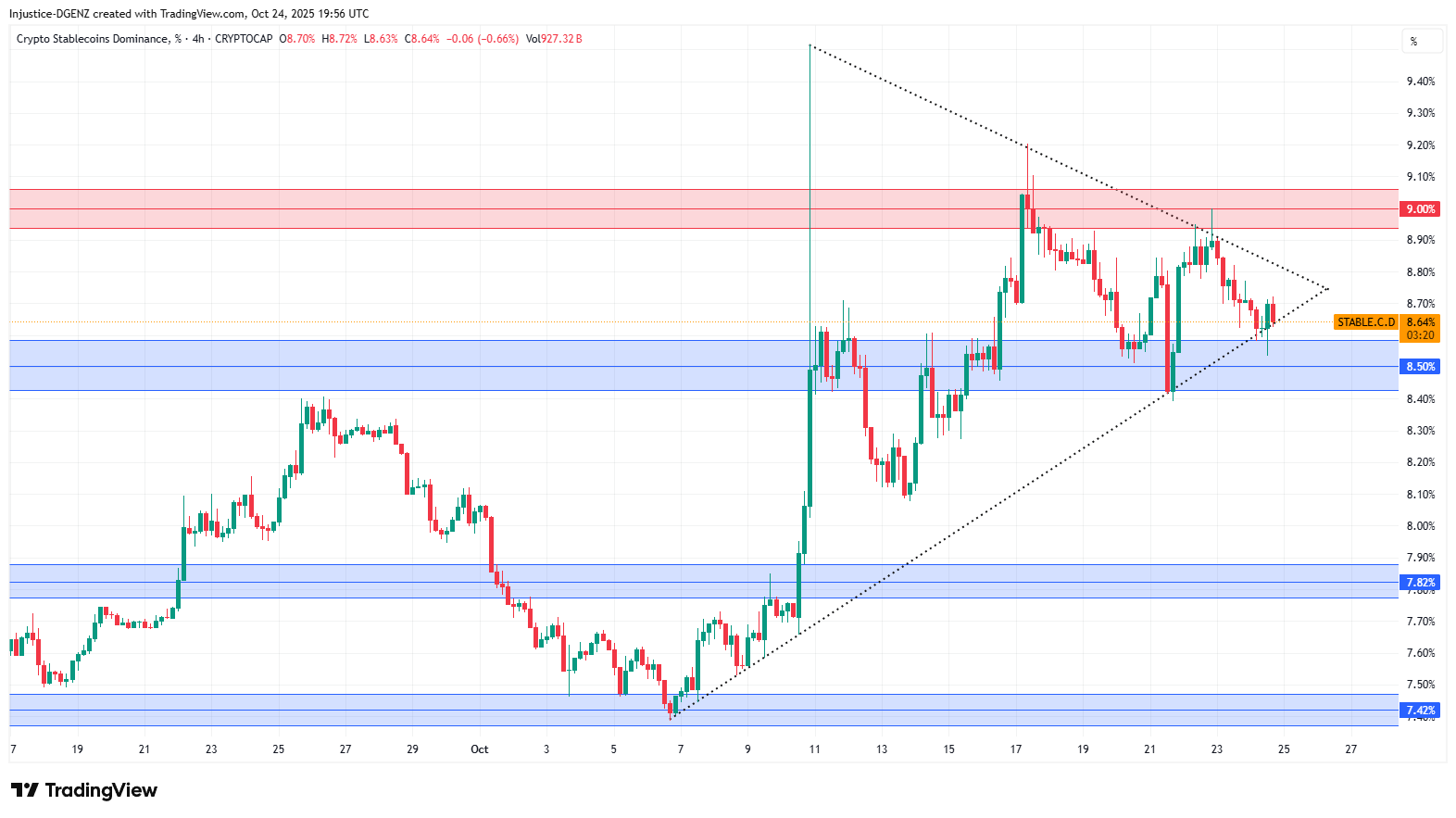 $STABLEC.D is bouncing off its support and ascending trendline again but things are tightening up fast. Price is now wedged inside a shrinking triangle, and volatility is getting ready to pop. Odds are we break to the downside. But the real trigger stays the same: a clean 4H (ideally 1D) close below 8.4% for a confirmed breakout to activate our long bias. Until then? Expect more fakeouts, chop, and sideways pain. Unless you’re sniping top gainers or extreme movers on a market structure shift, the best play right now might be no play at all. Wait for the breakout and let stablecoin dominance show its hand.
