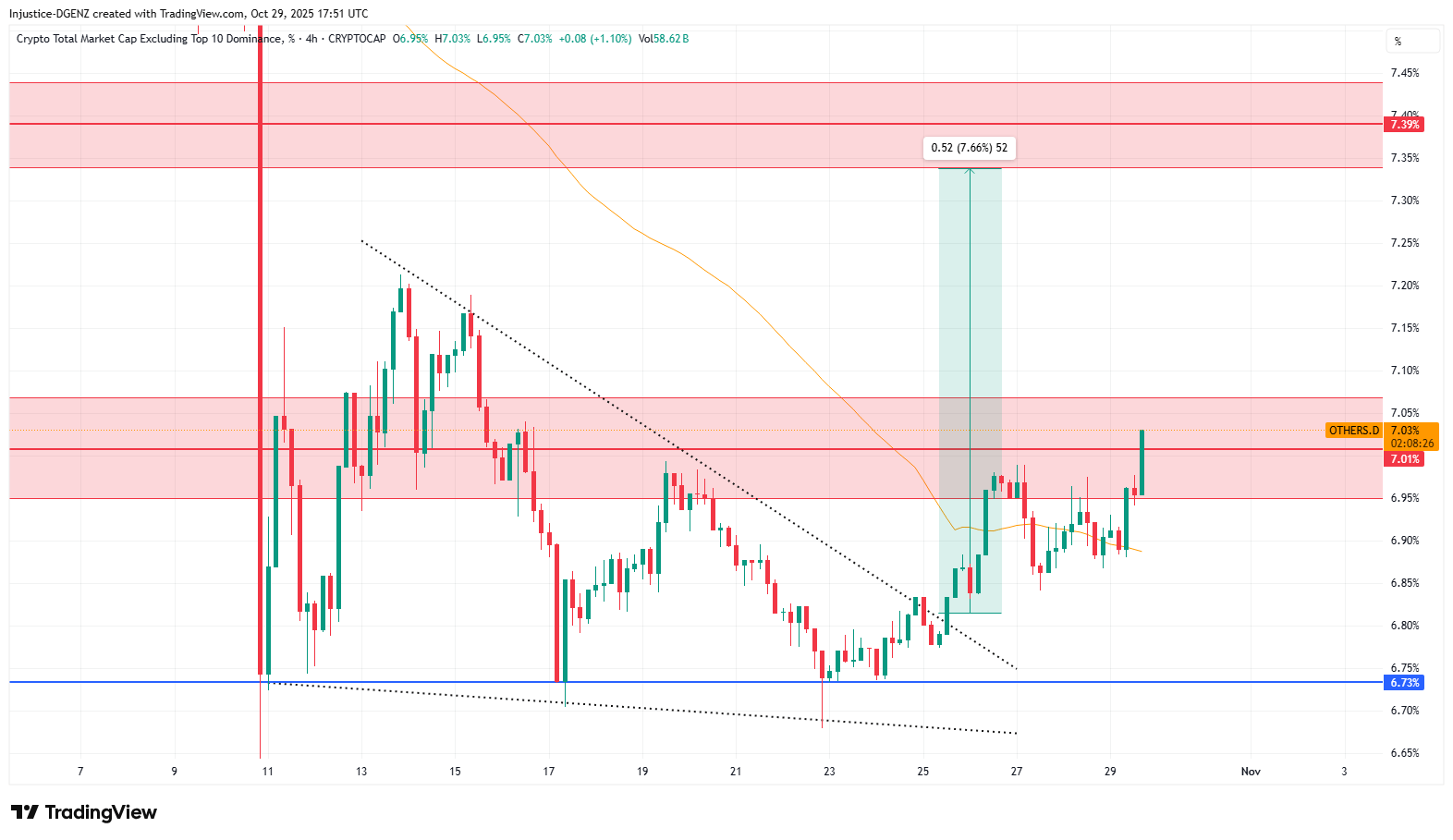 The $OTHERS.D chart (aka total crypto dominance excluding top 10) broke out of the falling wedge we discussed last week and is currently testing our 7% resistance and hopefully heading towards our technical breakout target at 7.34%. One way to know if alts are going to continue climb is to monitor the daily chart and watch for a daily close above 7.01%. If we can close this daily candle where we are at now then we have a bullish change of character and can expect to see more upside. But, the rally could only last a day if the meeting between the US and China turns into another dick swinging contest.