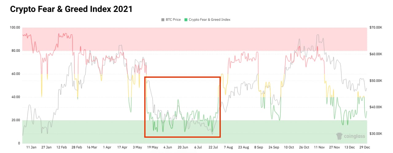 Need a reminder? In 2021, arguably the wildest bull run ever, we spent three months stuck in Fear territory right before Bitcoin doubled and the market entered up only mode.