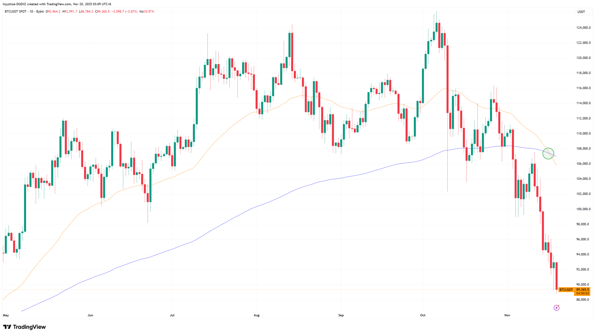 $BTC is down nearly 14% this past week and now chilling at ~$89K. That’s after dumping below its 50-week moving average, a level that’s basically the market’s long-term heartbeat.