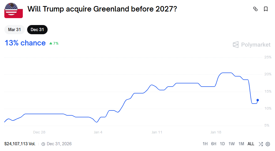 Polymarket currently puts the odds of the US successfully purchasing Greenland at roughly 13 percent. Meaning the market is pricing a 87 percent chance this never happens.